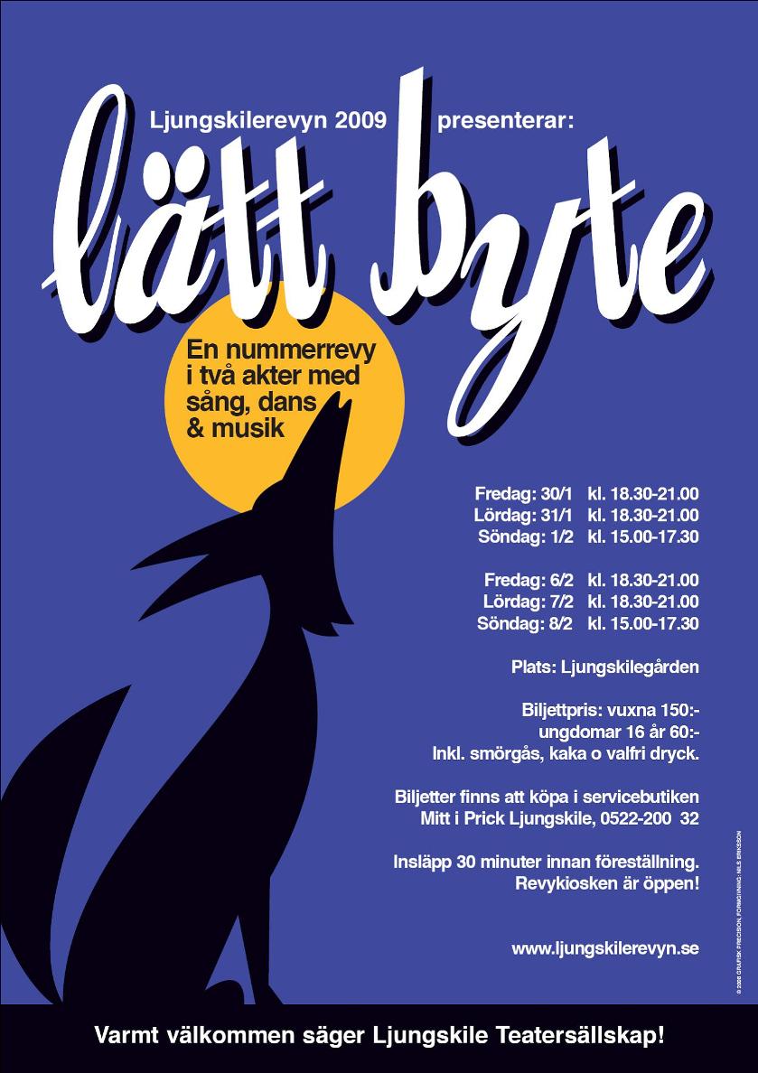 Under vintern 2009 har Ljungskile Teatersällskap spelat sin tolfte revy. Sommarens glada idéer strukturerades till ett digert program av vassa dialoger varvade med skön musik med glada sångtexter och eldig dans. Som alltid var lokala förhållanden (och missförhållanden) fokus i handlingen, och vi har fått en fin presentation av ombyggnadsarbetet i Ljungskile centrum och förändringarna i Ulvesund av de lokala radioreportrarna, som förtvivlat försökt göra stor journalistik av trafikkaoset på Ljungskiles blivande paradtorg. Men omvärldsanalys saknades inte: det dåliga vattnet i Lilla Edet ägnades samma uppmärksamhet som presidenten i Förenta Staterna Barack Obama. Han kom till Ljungskile för att leta efter sina rötter bland "the Backamo Baracks". Hans medtävlare John McCain saknades inte heller på scenen. Och mellan numren i den röda tråden fick vi se och höra fristående nummer med, trots flera nyrekryteringar, den alltmer rutinerade och nästan professionella ungdomsensemblen med skönsjungande Elin Fredriksson som yngsta medlem, i god kontrast till 81-årige professor Blasenwetter (Robert Staiger), som berättade om tyska initiativ ifråga om vindkraft och biogas: das deutsche Windkraft kommt vom Sauerkraut, was in Schweden Fjärtwärme genannt ist! Orkestern har som vanligt underhållit med början 15 minuter före föreställningen, och i pausen serverade kökspersonalen kaffe och dricka med smörgås och kaka till publiken. Lätt byte har uppmärksammats i pressen, se artiklar i länklistan till höger! Radion presenterade Lätt byte i en intervju med Carmen Hergens 2009-01-02 i programmet 10.30 - 11.00 (se länken till höger). 2009-01-15 fyllde Ljungskilerevyn första sidan i Bohusläningen. Ett stort reportage på första sidan i Uddevallasektionen berättar om årets revy Lätt byte och verksamheten i Ljungskile Teatersällskap. Läs mer>>