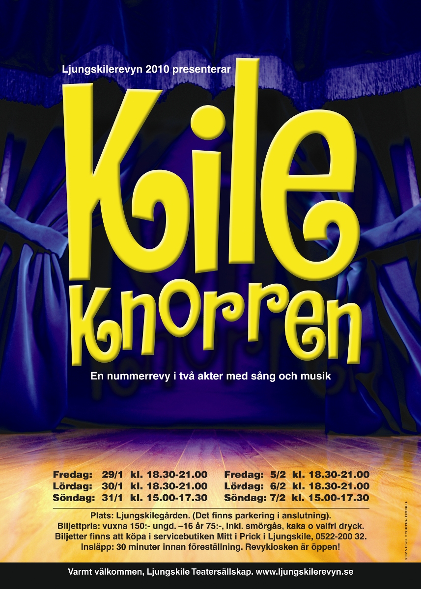 Ljungskile Teatersällskap har just avslutat sin trettonde revy. En av Teatersällskapets grundare, Gunilla Sjöqvist, har gjort come-back efter ett par års frånvaro. I övrigt har många av de erfarna revyamatörerna funnits på scenen, av vilka flera är påtagligt unga. Det är en stor glädje för Ljungskile Teatersällskap att så många av ungdomarna vill stanna i ensemblen, samtidigt som nya unga förmågor har rekryterats. Revyn har som alltid haft ett mycket blandat innehåll, där man prioriterat humor, sång och dans. Handlingen har varit både lokal och global, det får du se när videoklippen kommer på hemsidan. Det kan avslöjas att såväl ortens badfaciliteter som den lokala textilindustrin apostroferas. Vi tackar Resteröds trikå som försett oss med kalsonger! En biljett till föreställningen har inte bara innefattat underhållning utan även kostlig spis: i pausen serverade kökspersonalen kaffe och dricka med smörgås och kaka.