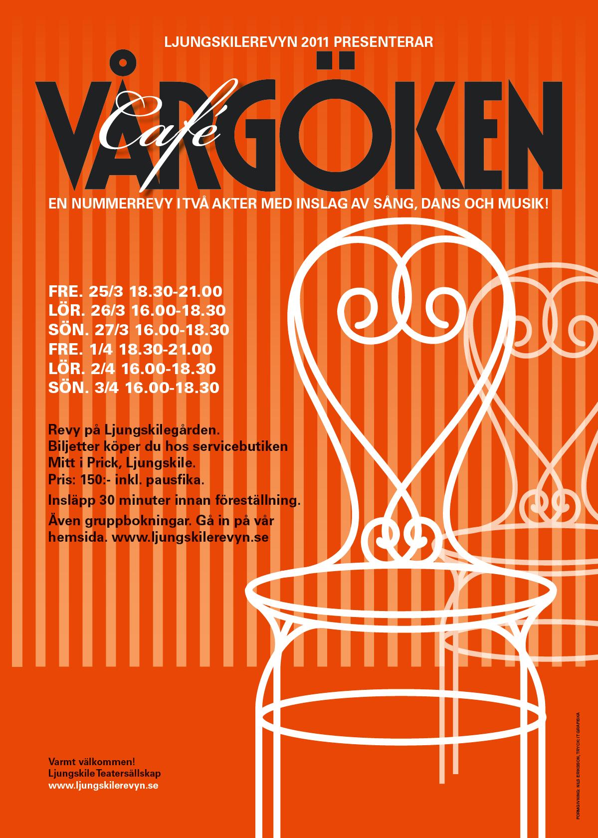 Ljungskile Teatersällskap presenterar sin fjortonde revy: Café Vårgöken. Som vanligt har ett antal ungdomar prövat in vid revyn och kommer att bidra till skönsång, humor och dans. Vi är glada att större delen av det gamla gardet åter ställer upp med sin gedigna rutin. Som vanligt har hela ensemblen och andra intresserade tillsammans skapat en nummerrevy, där kanske litet mer av röd tråd kan skönjas än vad vi brukar erbjuda. Årets revy handlar just om - Café Vårgöken - ett fiktivt näringsställe i Ljungskile eller vilken som helst annan ort med de egenskaper som gör Ljungskile unikt. På cafét samlas ortens befolkning och dryftar livets djupa frågor likaväl som dagens futiliteter utan att på något sätt hävda att man löser livets gåta, och inte heller någon annan gåta. Men en tilldragelse är av stor betydelse: man beslutar att vidga caféts verksamhet, vilket har till följd att dess nya namn blir Nattkröken, Ljungskile första (och ännu inte existerande) nattklubb. Med detta höjs tempot, och vissa tävlingsmoment kommer att initieras. I biljettpriset ingår även kaffe/te/dricka med smörgås och kaka i pausen.
