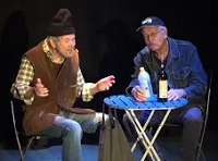 Gunnar Lönnqvist sitter vid ett cafébord och dricker vin när Lennart Jacobson på lätt ostadiga ben